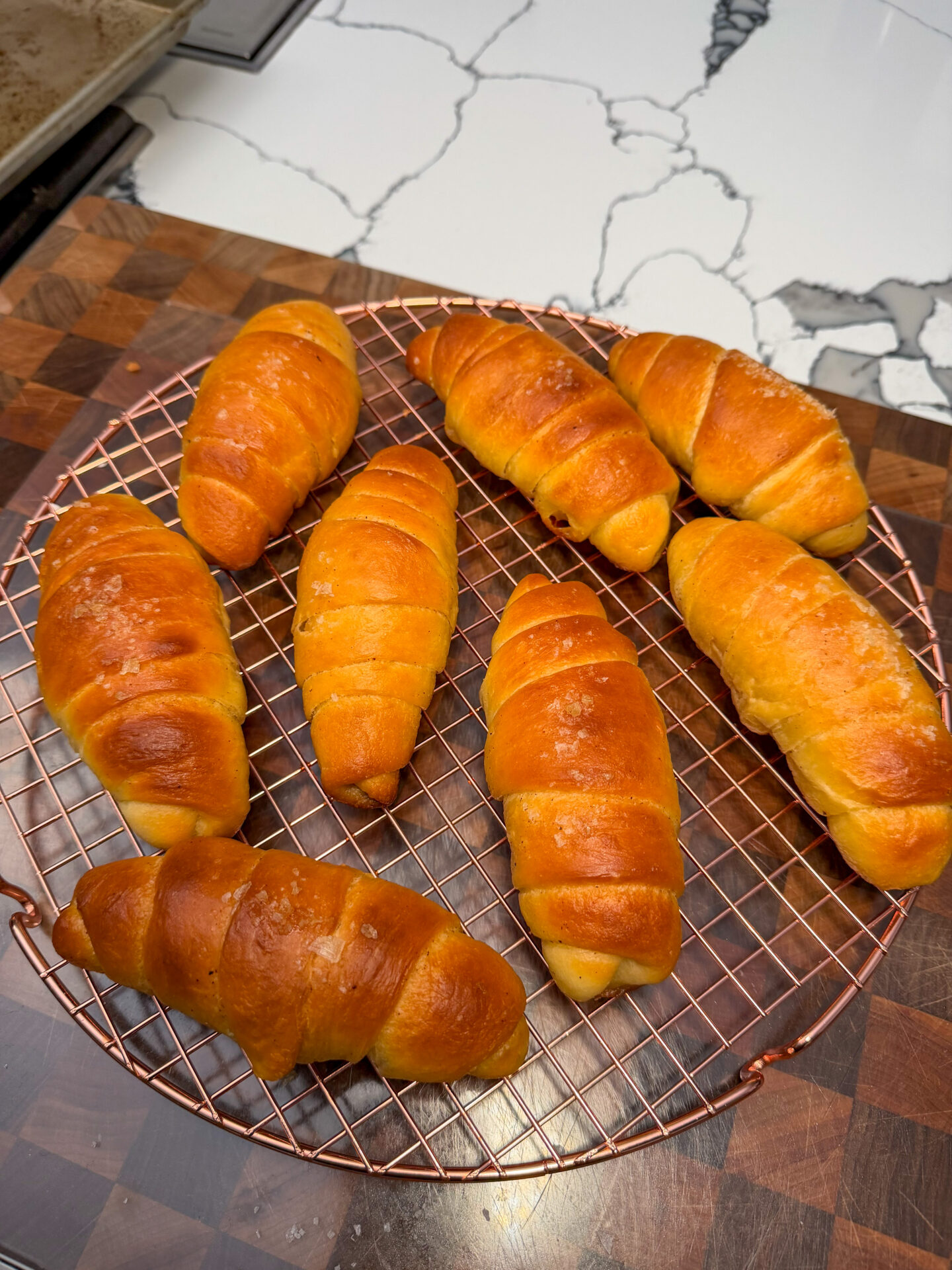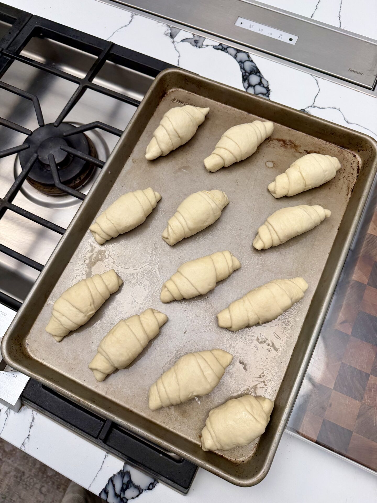 After mixing, the dough rested for about one hour, allowing it to relax and begin fermenting. I did poof mine in the oven by heating my oven to 200 then turning it off and adding a cup of hot water. This allowed my dough to rise effectively. Once it rose, the dough was divided evenly into 12 portions. Each portion rested again briefly, which made shaping easier and prevented the dough from snapping back. From there, each piece was rolled into a long, tapered shape, often described as a tadpole shape, with one end slightly thicker than the other. A large piece of cold butter was placed at the thicker end, and the dough was rolled tightly around it, sealing the butter inside. This butter is what creates the signature airy interior and slightly crisp, buttery bottom as it melts during baking.