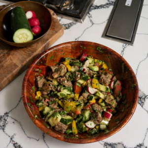 What I love most is how simple it is. No complicated steps, no overthinking. Just good ingredients, cooked well, and a fresh dressing that pulls everything together. The combination of cucumber, bell pepper, radish, and tomatoes gives you that crunch and freshness, while the steak brings richness and depth. And that dressing? It’s light, zippy, and herb-forward with just enough acidity from the balsamic and lemon juice to balance everything out.