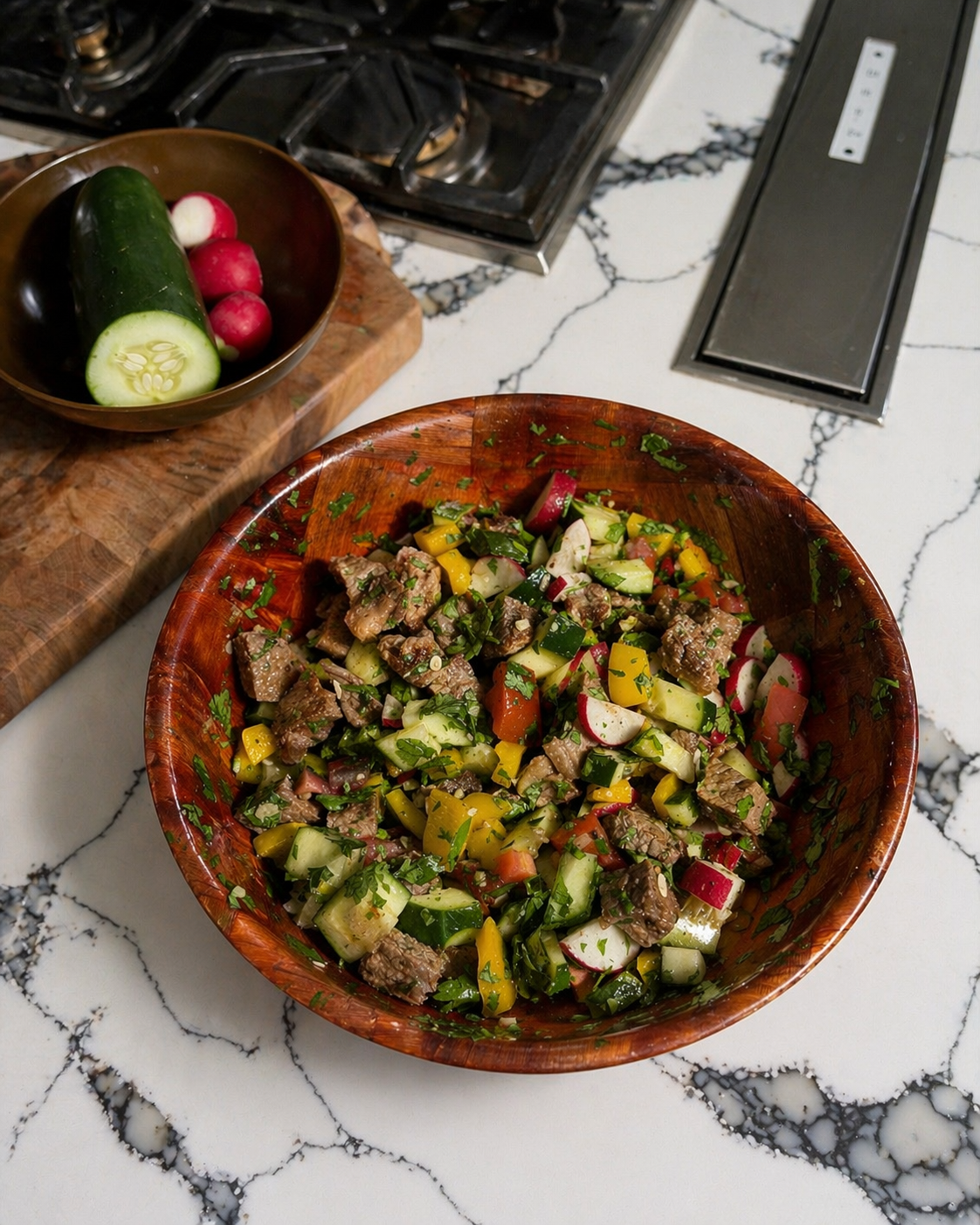 - While the steak rests, prepare your vegetables. Dice the cucumber and bell pepper, thinly slice the radishes, and chop the tomatoes. Add everything to a large bowl.
